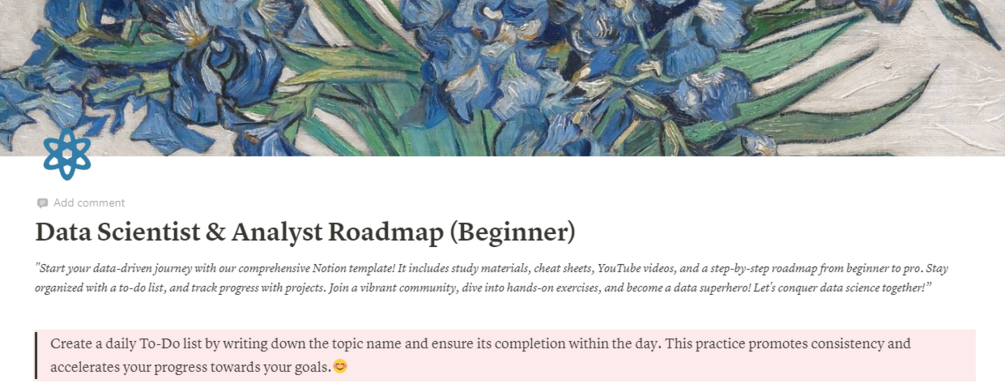 Accelerate your journey as a data scientist and analyst with our comprehensive Notion template - the Data Scientist & Analyst Roadmap (Beginner). Packed with essential study materials, cheat sheets, and practical resources, this template equips beginners with the knowledge and tools to kick-start their careers. Organize your learning with a curated collection of study materials, leverage handy cheat sheets for quick reference, and unleash your creativity by capturing project ideas on a dedicated page. Start your data-driven adventure today and unlock your full potential!